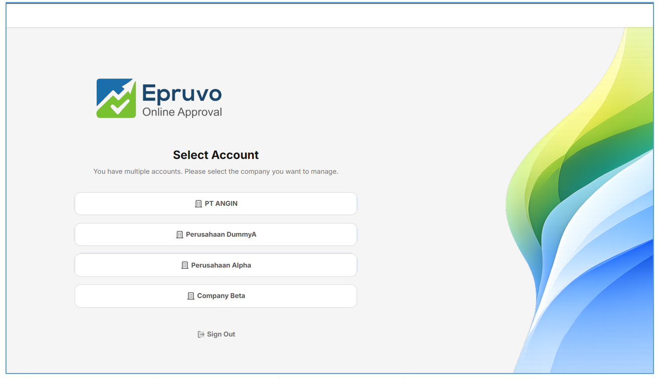 - Jika user berada di beberapa perusahaan berbeda, maka saat login akan muncul tampilan untuk memilih ingin login sebagai user di Perusahaan yang mana, bisa diihat seperti pada gambar berikut