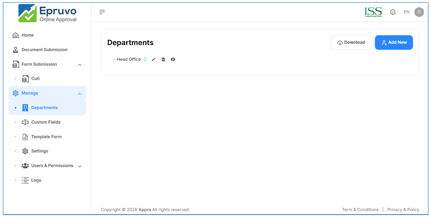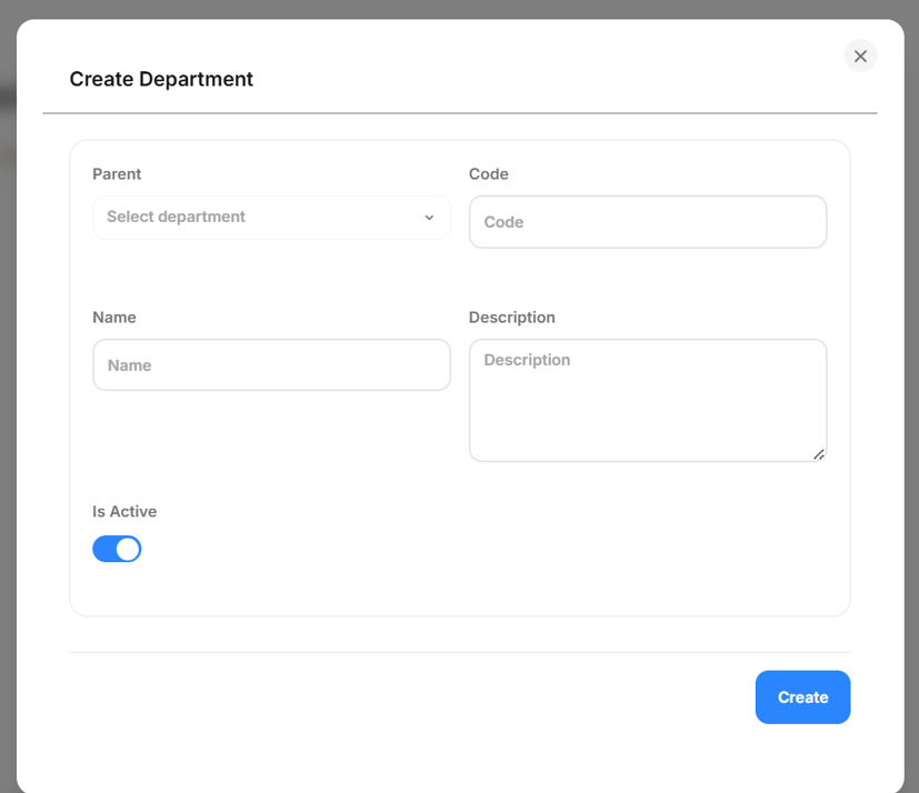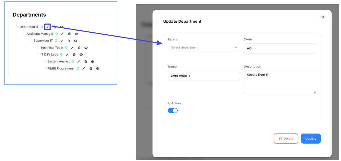 - Nyalakan switch Is Active untuk mengaktifkan Department, Jika off maka Department ini dianggap tidak ada
