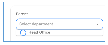 - Pada kolom Parent, silahkan pilih Atasan dari Departmen yang akan dibuat, karena baru ada 1 maka pilihannya hanya bisa pilih department paling atas