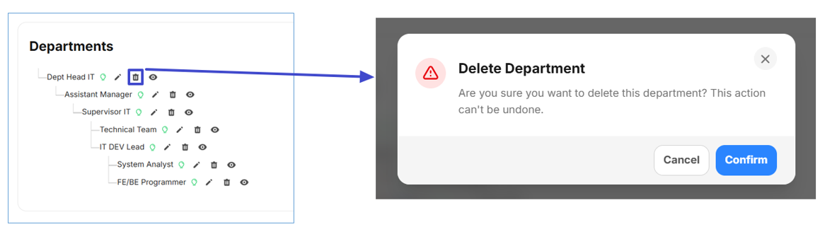 - Masih di Menu Department, Klick tombol untuk delete department, pada pop up konfirmasi klick tombol Confirm