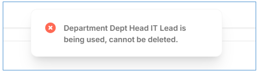 - Jika department tersebut sedang dipakai maka akan muncul validasi, bisa dilihat pada gambar berikut
