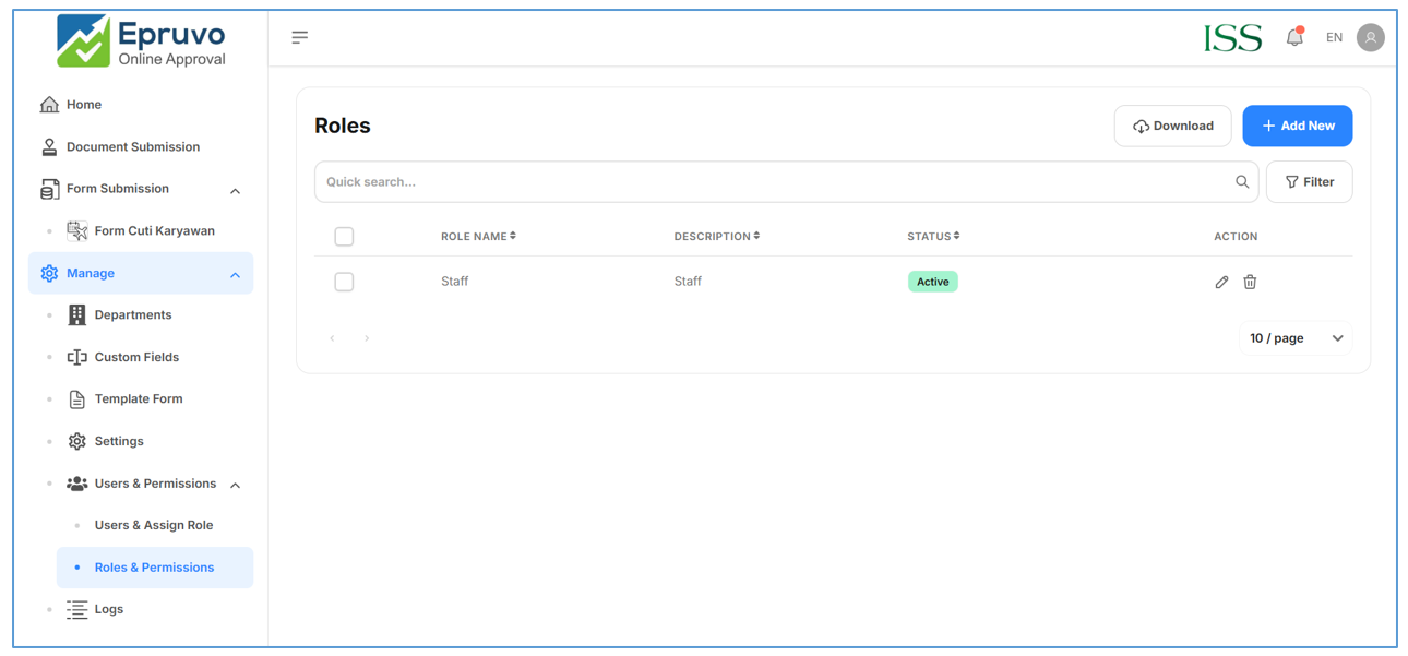 - Tampilan Menu “Roles & Permissions” akan tampilan seperti pada gambar berikut. Untuk membuat Role Baru klick tombol “Add New”