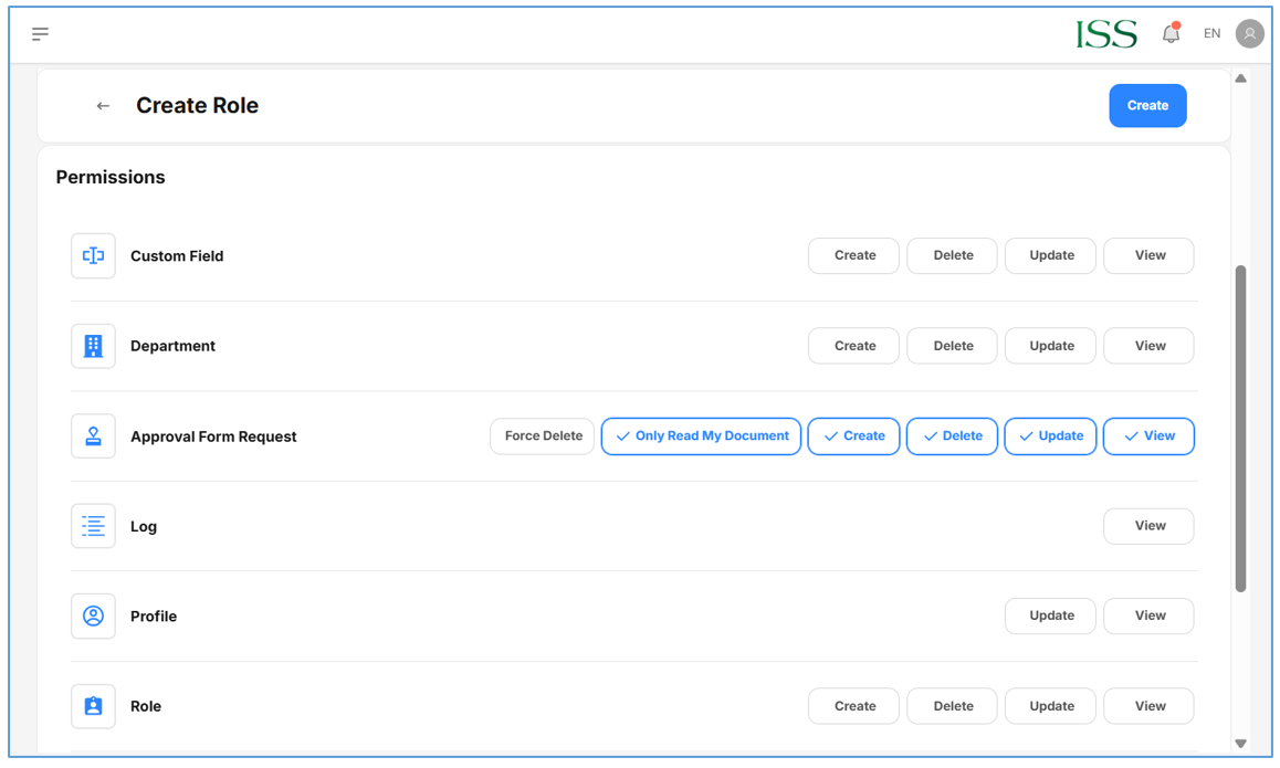 - Pada bagian Permissions silahkan klick dan nyalakan Setiap Akses yang ada di setiap menu, seperti Create, view, delete, update, dan sebagainya.