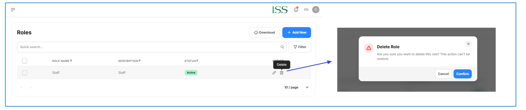 - Masih di Menu Role, Klick tombol untuk delete role, pada pop up konfirmasi klick tombol Confirm
