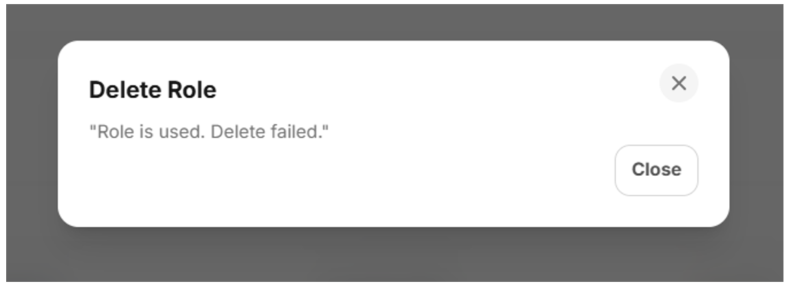 - Jika role tersebut sedang dipakai maka akan muncul validasi, bisa dilihat pada gambar berikut