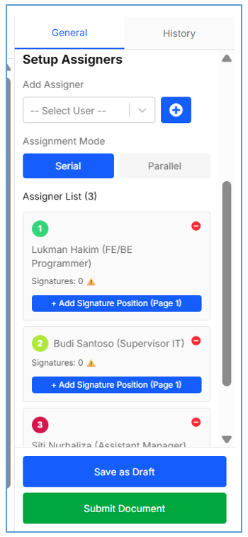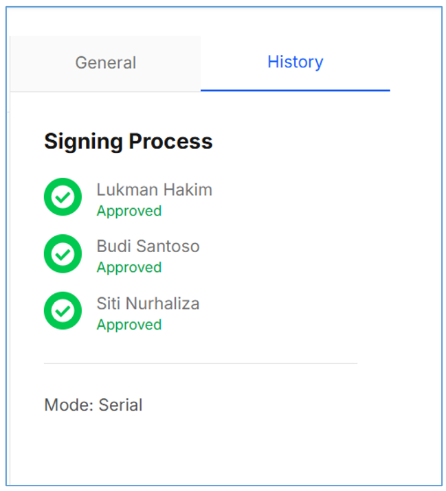 - SerialJika pilih Serial, maka Metode urutannya akan sesuai urutan posisi dari signer nomor 1 sampai terakhir (atas kebawah). Jadi Signer kedua hanya bisa Sign jika Signer 1 sudah Sign, dan seterusnya. Email dan notifikasi juga akan dikirim secara bergantian, jika ada Signer yang reject maka dokumen akan langsung dikembalikan ke Requestor untuk direvisi