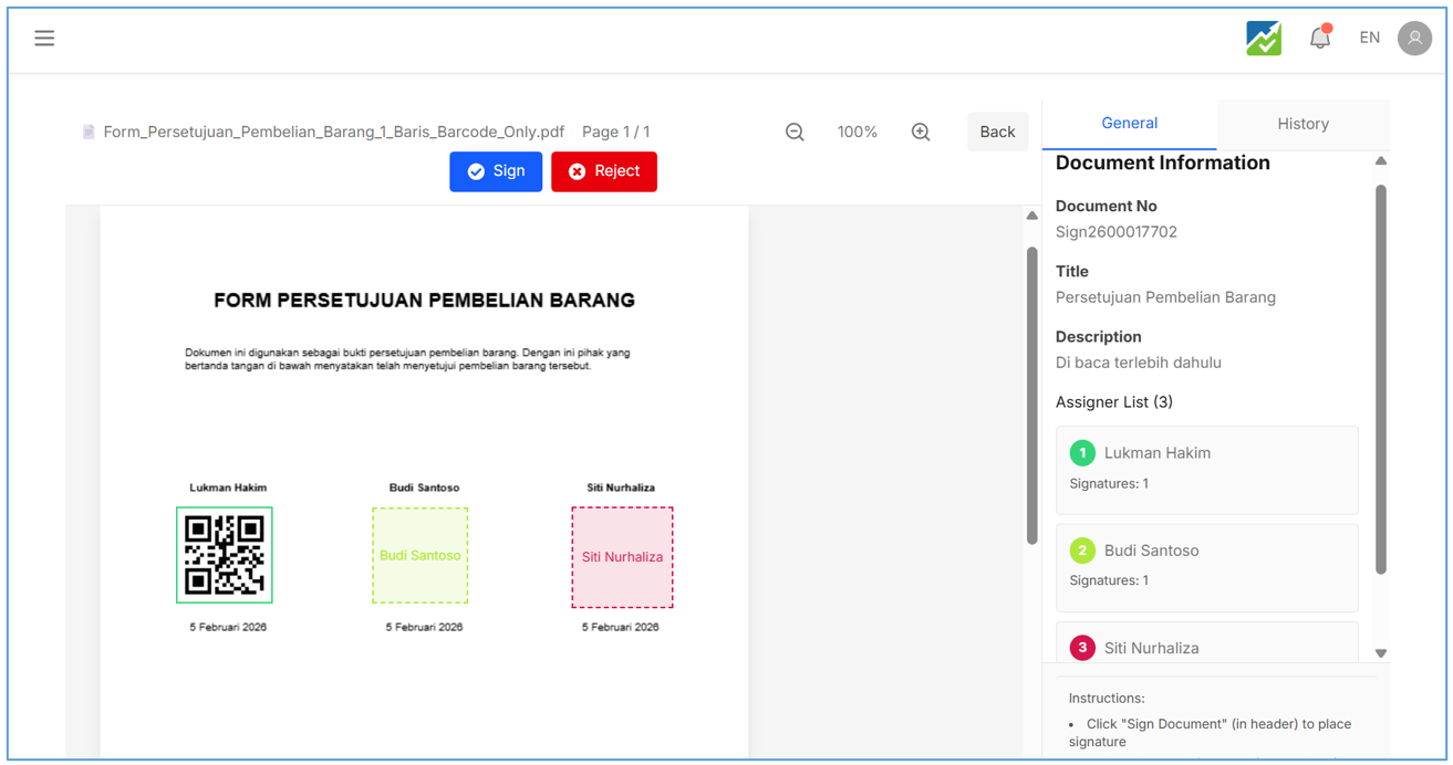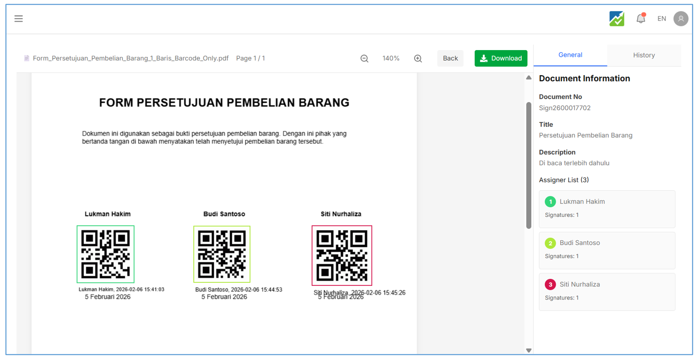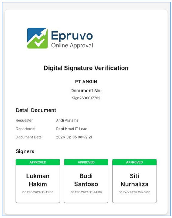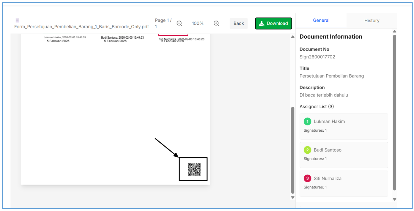 - Barcode Signature jika di scan, hanya menampilkan informasi No dokumen, Nama dan Timestamp Approve , contohnya :