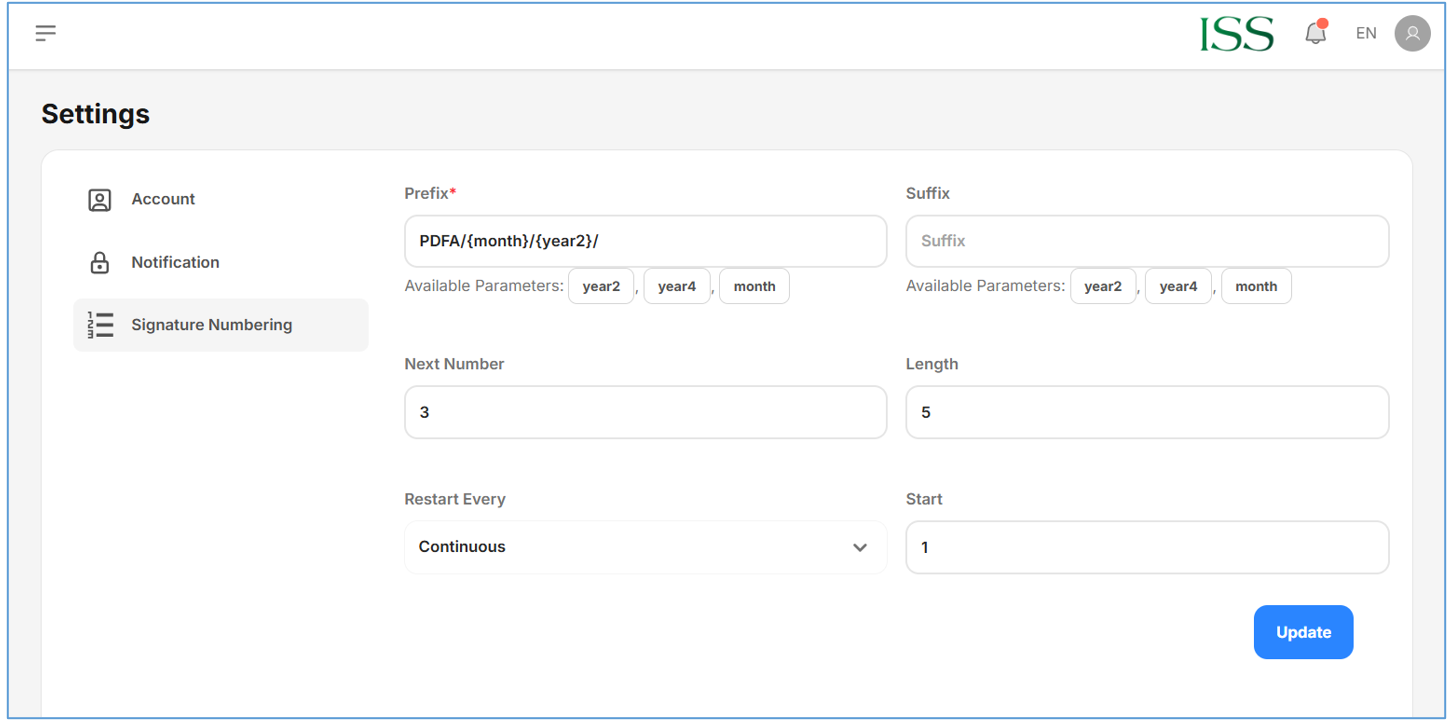 - Buka Menu Settings dan pilih tab “Signature Numbering”. Halaman Signature Numbering akan ditampilkan seperti pada gambar dibawah