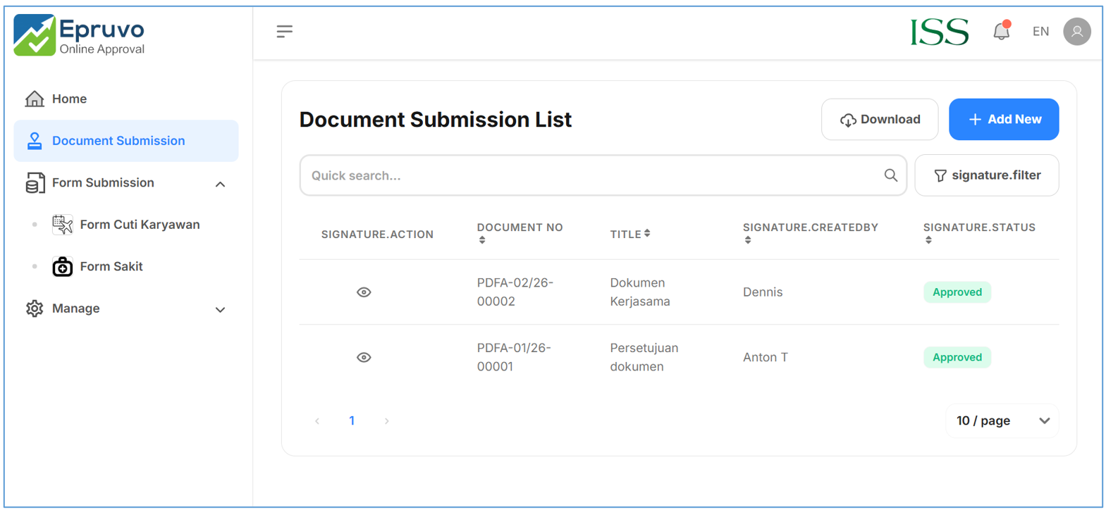 - Berikut tampilan Document Submission yang masuk ke approver bisa dilihat seperti pada gambar dibawah
