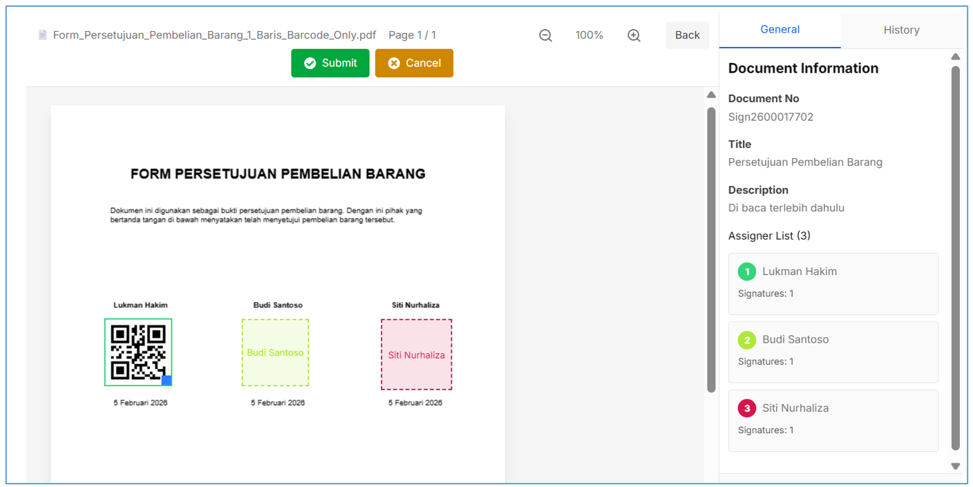 - Jika sudah sesuai, klick tombol [Submit] untuk melanjutkan ke Signer selanjutnya.