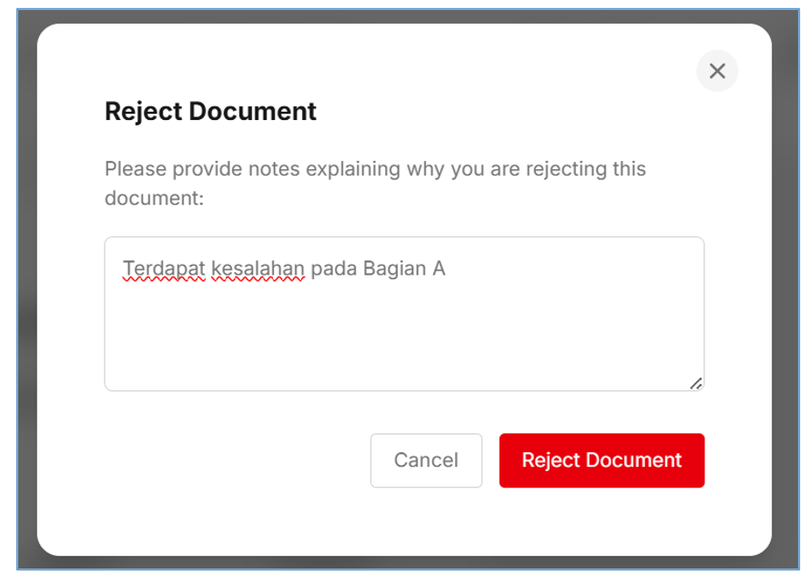 - Klick tombol [Reject] untuk mereject Document Submission,