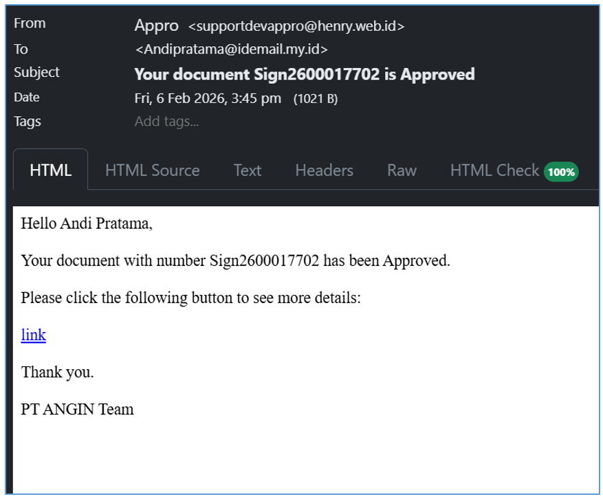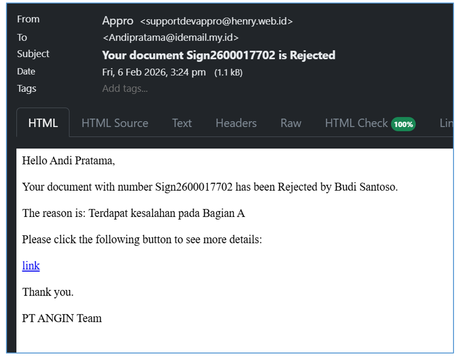 - Selain dari notifikasi lonceng, bisa di cek ke email yang masuk seperti pada gambar berikut
