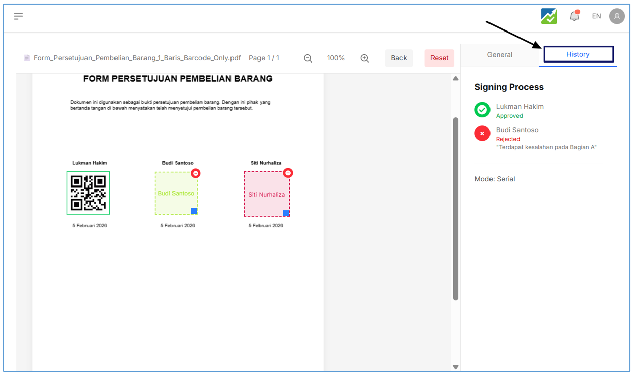 - Klick Tab Histories untuk melihat siapa saja user yang menandatangani dokumen, bisa dilihat seperti pada gambar dibawah
