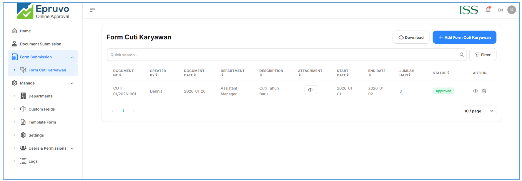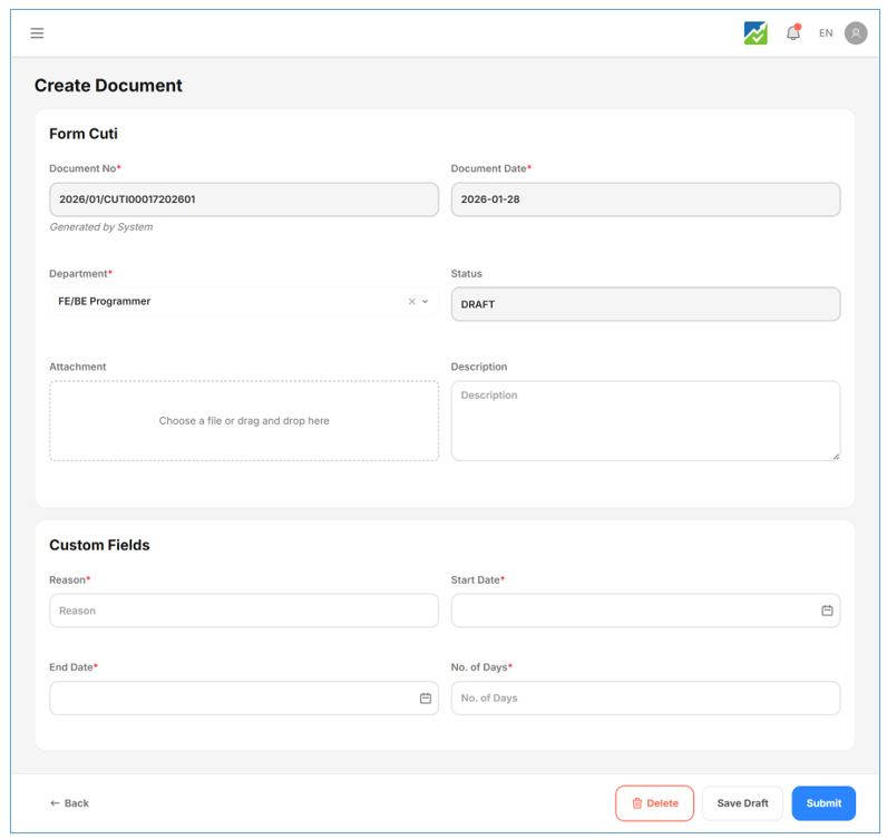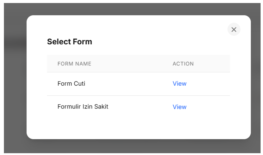 - Pada menú Form, Sorot Form yang tersedia sesuai yang dibuat di master Template Form. Misal Form Cuti Karyawan