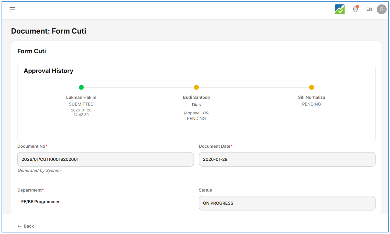 - Setelah klick tombol submit, tampilan timeline approval akan ditampilkan di atas, sesuai dengan logika step yang ditentukan di master Template Form, bisa dilihat seperti pada gambar berikut