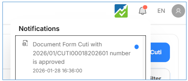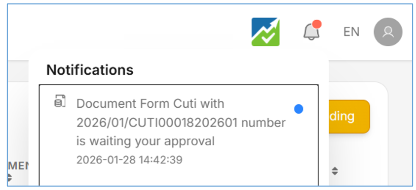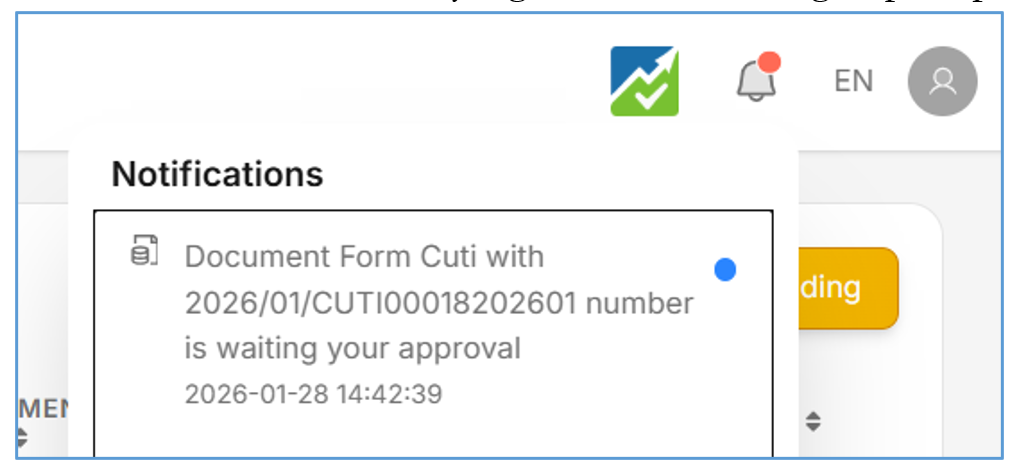 - Sebagai Approver silahkan bisa cek notifikasi yang masuk di lonceng, seperti pada gambar berikut