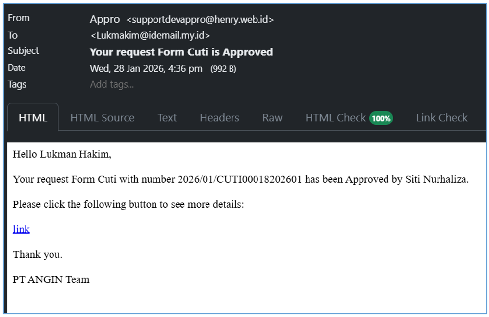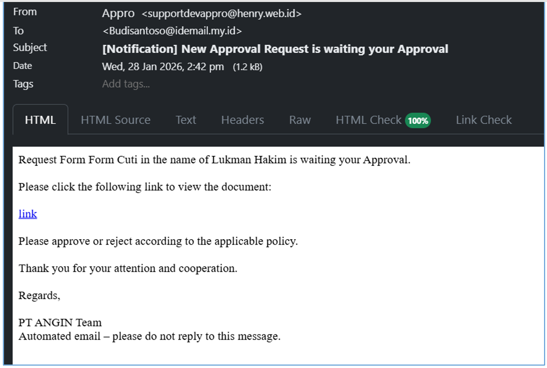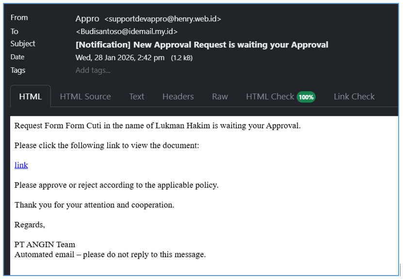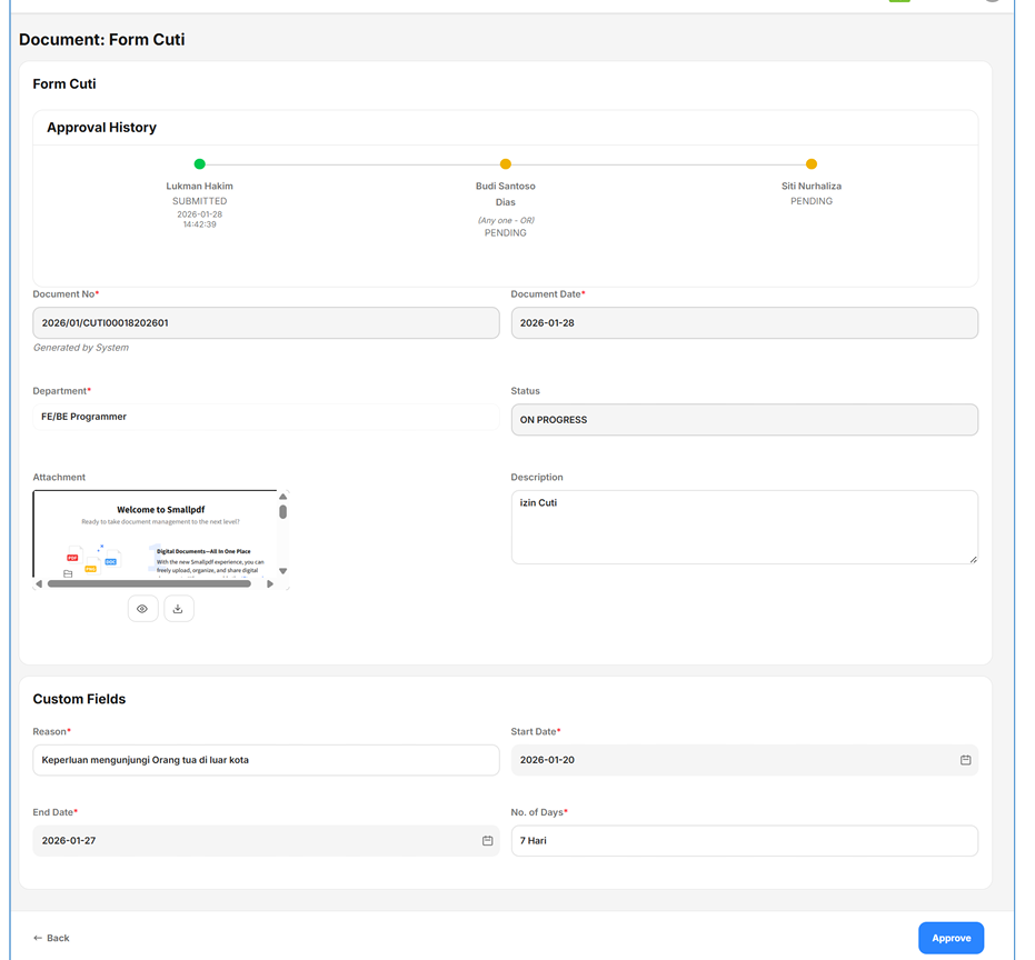 - Berikut tampilan Form approval yang masuk ke approver bisa dilihat seperti pada gambar berikut