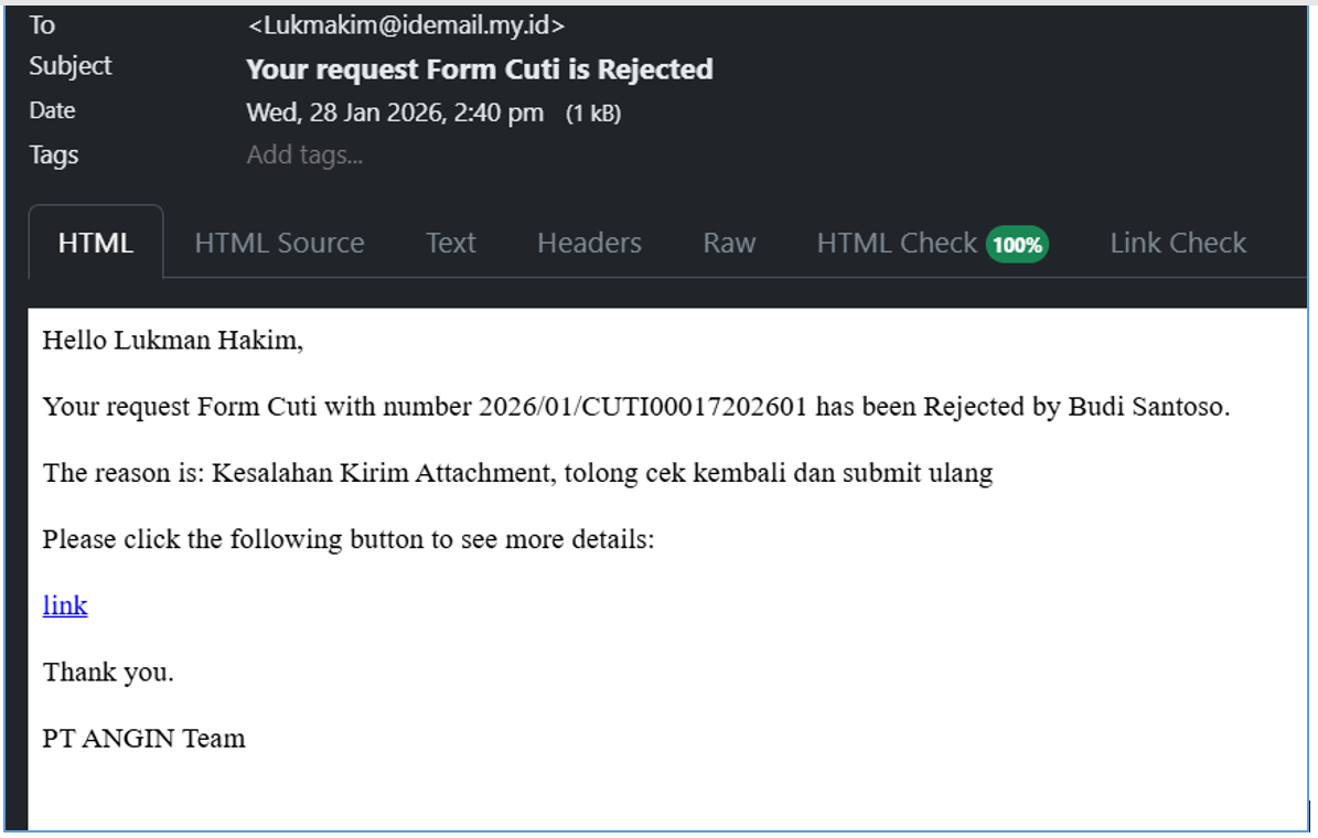 - Selain dari notifikasi lonceng, bisa di cek ke email yang masuk seperti pada gambar dibawah