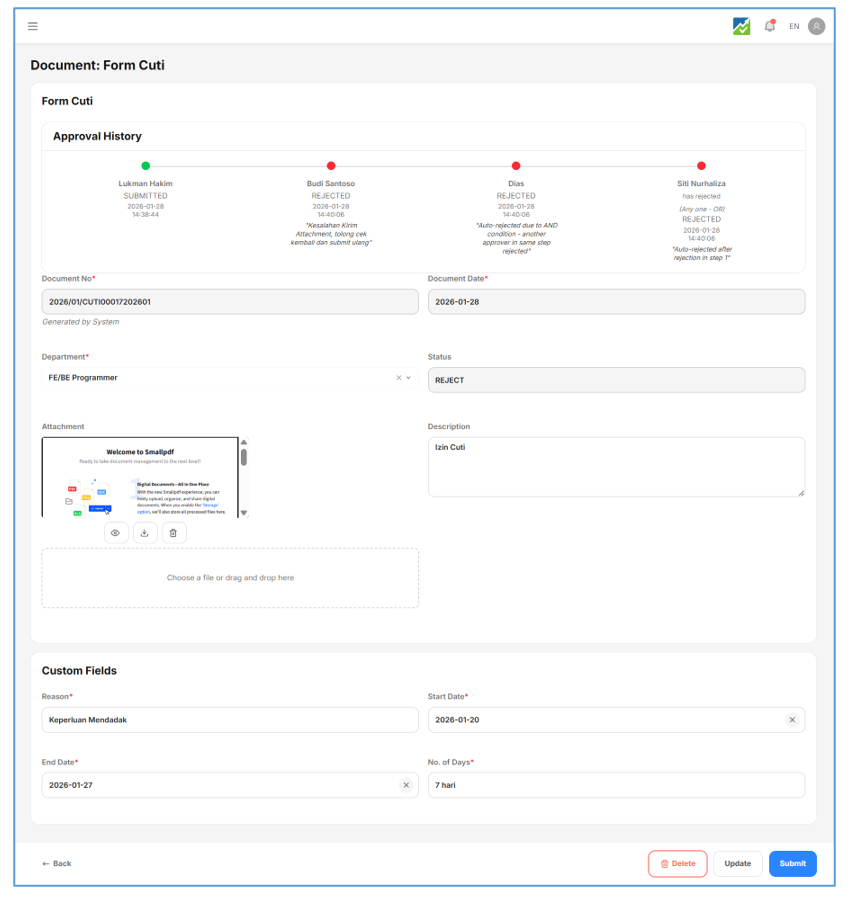 - Silahkan perbaiki informasi yang diminta approver, setelah diganti klick tombol “Submit” untuk mengajukan ulang document. Document yang diajukan ulang akan kekirim dari step pertama lagi.