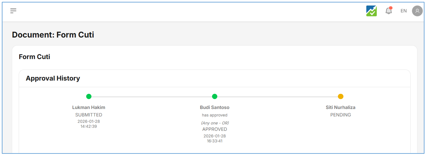 - Agar form disetujui secara menyeluruh, setiap user yang ada di timeline approval harus disetujui oleh semua user.