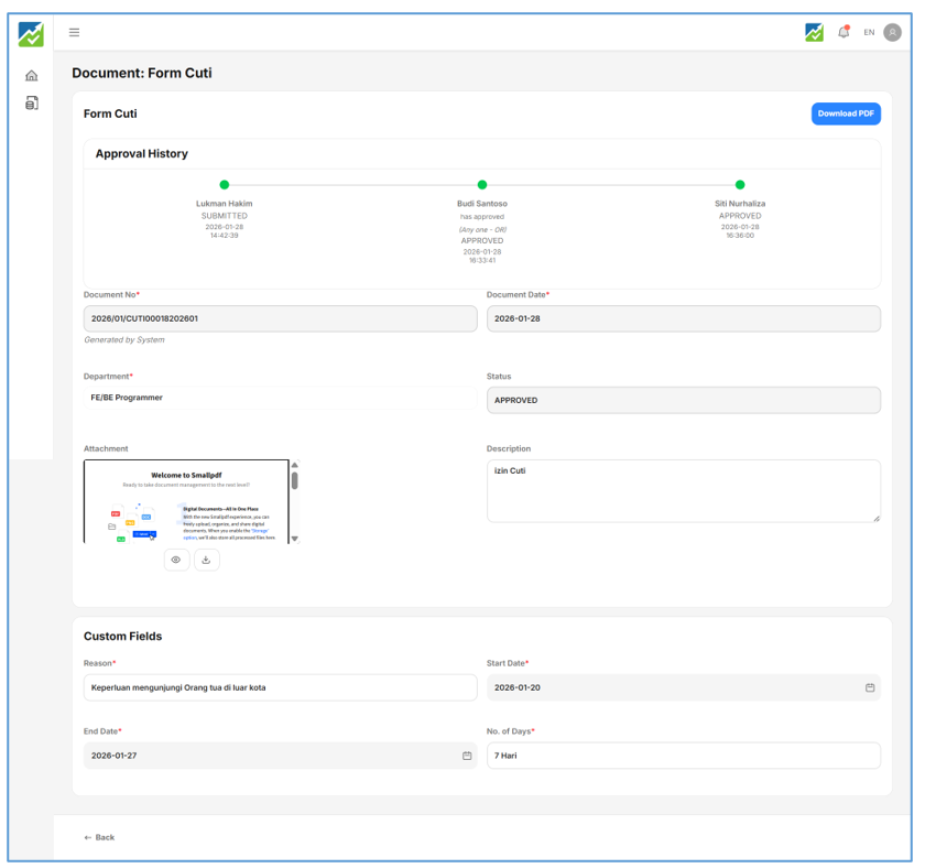 - Perhatikan pada Kotak timeline approval, klick tombol [Download PDF]
