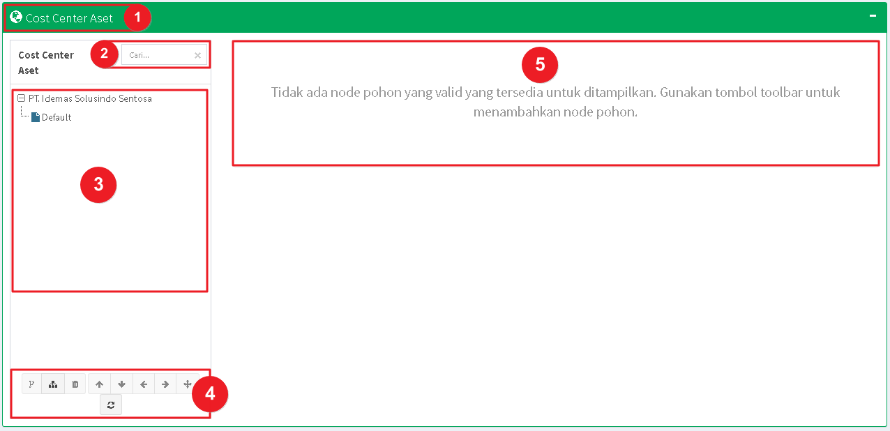 Catatan: Untuk Departemen, Penanggung Jawab, Pengguna, Kategori dan Lokasi Aset menggunakan pengelolaan Tree-View, yang menampilkan daftar susunan hirarki. Berikut akan dijelaskan terlebih dahulu komponen halaman Tree-View, beserta penggunaannya. Untuk bagian selanjutnya yang juga menggunakan Tree-View dapat merujuk kepada penjelasan ini.