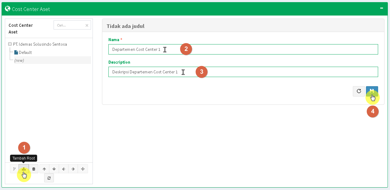 Form pengelolaan Tree-View akan menampilkan form Nama dan Deskripsi dari data yang Anda pilih pada Tree-View. Untuk penambahan data atau sub-data baru, form kosong akan disediakan, silahkan isi Nama dan Deskripsi sesuai kebutuhan, kemudian klik Simpan. Data atau sub-data akan otomatis ditampilkan pada Tree-View.