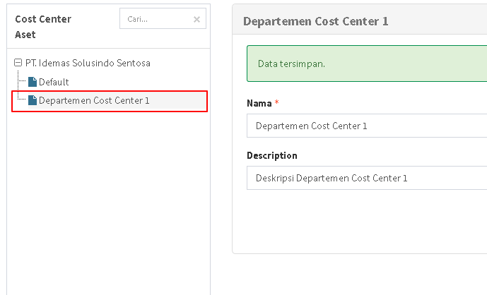 Tampilan berhasil menambahkan Cost Center Aset