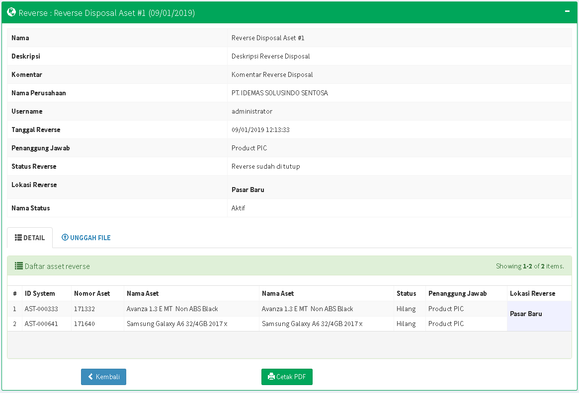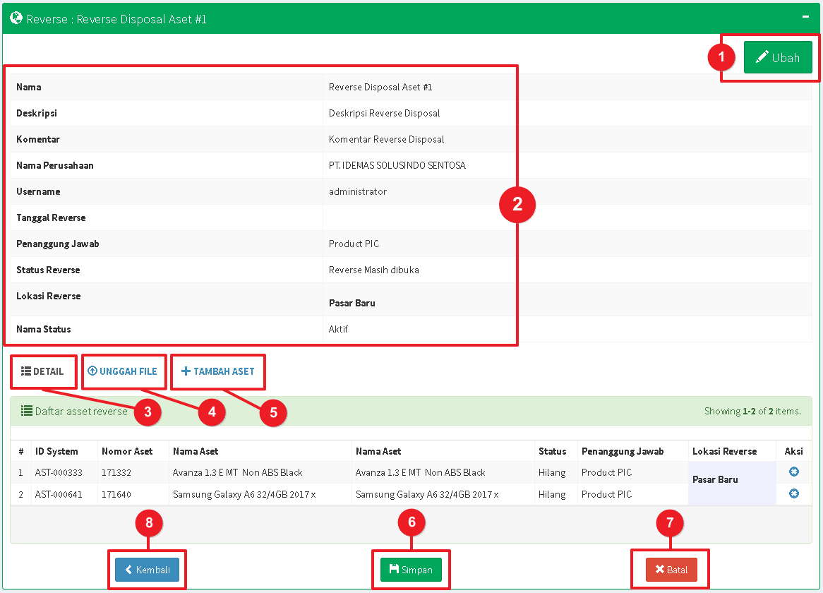 Catatan: Sampai dengan dibuatnya dokumen reverse disposal aset, aset yang hendak dikembalikan kondisinya terkunci dan tidak diperkenankan untuk mengubah informasi apapun yang berhubungan dengan aset tersebut. Tetapi status aset masih belum berubah menjadi aktif kembali hingga dokumen reverse disposal diproses.