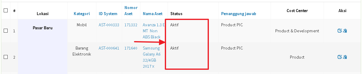 Status Aset akan berubah dari disposal menjadi aktif, seperti dapat dilihat pada gambar berikut.