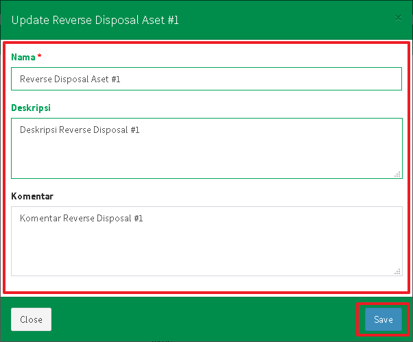 Klik tombol Simpan untuk memproses transaksi reverse disposal dan menyetujui pengembalian aset. Dokumen reverse disposal akan otomatis diselesaikan, dan status dokumen akan otomatis berubah menjadi Reverse Disposal Sudah Ditutup.