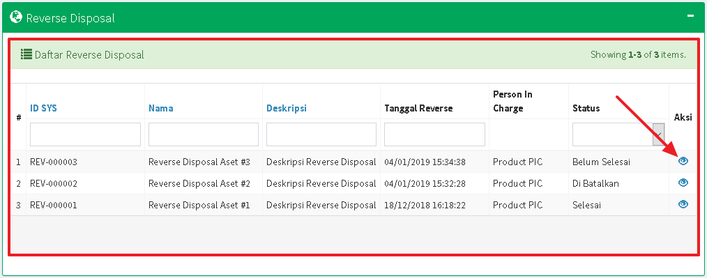 Tanggal Reverse menjelaskan tanggal kapan transaksi reverse disposal dilakukan, bukan informasi kapan dibuatnya dokumen reverse disposal. Kolom tanggal reverse akan tetap kosong selama status dokumen reverse MASIH DIBUKA.