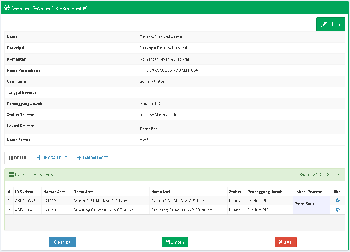 Klik tombol simpan reverse disposal untuk memproses transaksi reverse dan menyetujui pengembalian aset.