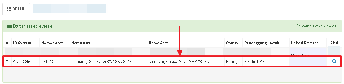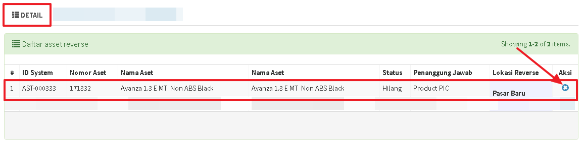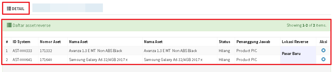 Langkah-langkah menambahkan Aset Disposal ke dokumen Reverse Disposal - Aset yang berhasil ditambahkan dapat dilihat pada Daftar Reverse Disposal Aset di tab DETAIL.