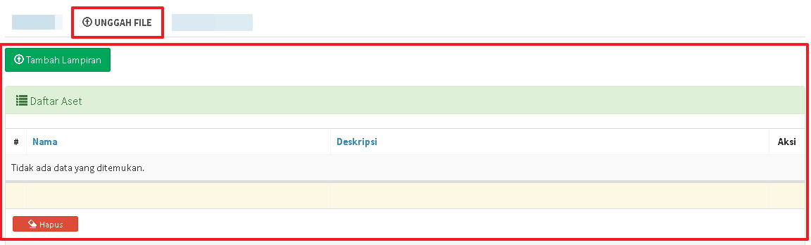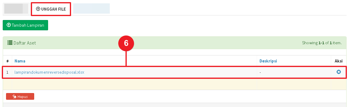 Kolom unggah file lampiran berisi daftar file lampiran yang digunakan sebagai pendukung dokumen reverse disposal. Sebagai contoh; dokumen persetujuan, dokumen rujukan reverse disposal atau bukti keberadaan aset.