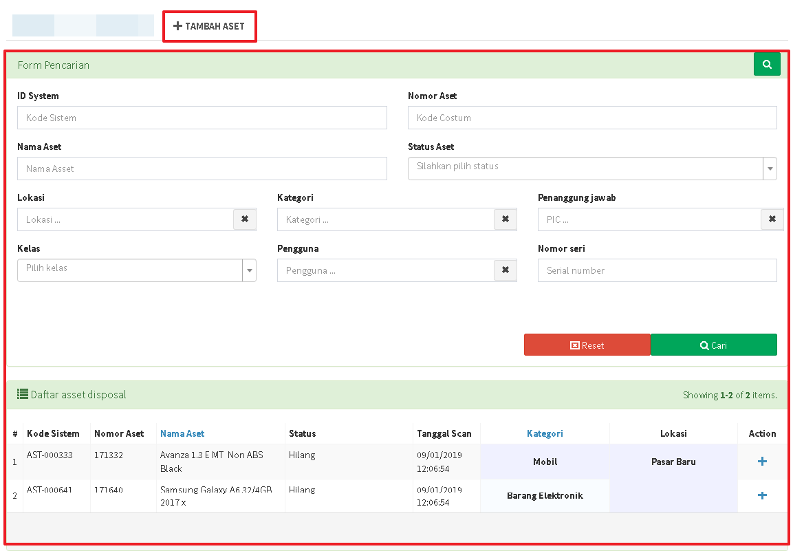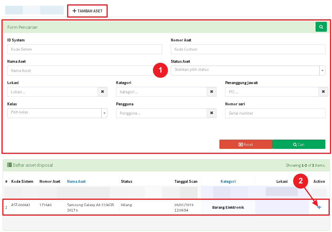 - Pilih tab TAMBAH ASET. Anda dapat pergunakan Form Pencarian untuk mencari aset yang hendak dimasukkan ke dokumen reverse disposal.