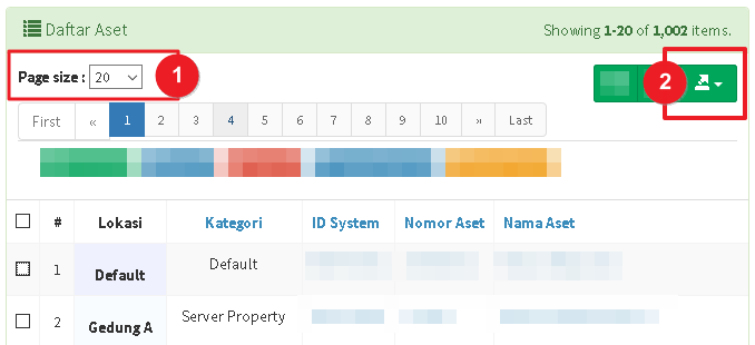 - Page Size Indicator, menentukan banyaknya data aset yang ditampilkan pada daftar aset.
