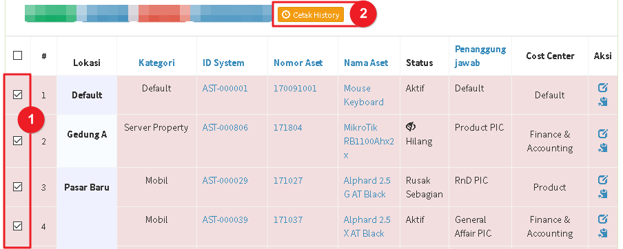 - Tombol Cetak History. Klik tombol history untuk mencetak riwayat dari aset yang dipilih.