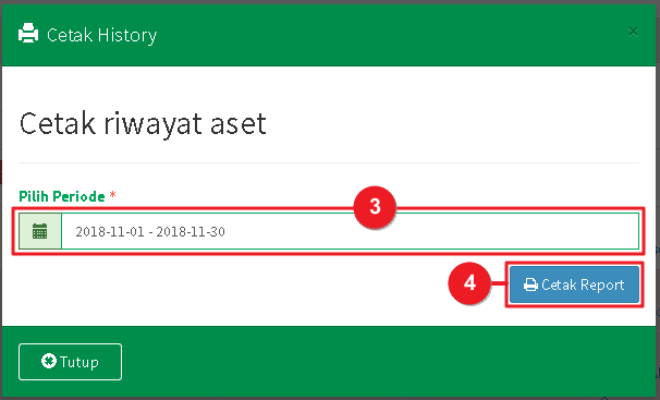 Klik Cetak History untuk mengunduh Riwayat Aset - Pada form Cetak History, tentukan periode yang dikehendaki dari tanggal awal sampai dengan tanggal akhir.