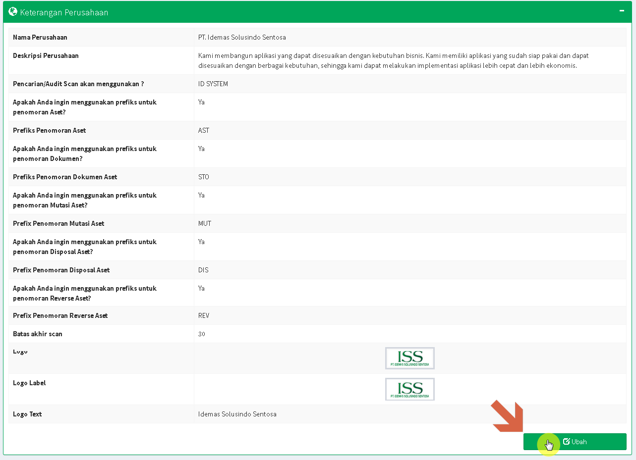 Halaman profil perusahaan selain berisikan Informasi Keterangan Perusahaan, juga berisikan beberapa pengaturan penting yang perlu diperhatikan sebelum Anda mulai melangkah lebih jauh ke pengelolaan Aset.