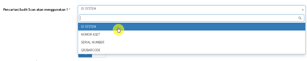 AsetKita memberikan kebebasan dalam menentukan Kode Utama yang digunakan sebagai acuan Pencarian/Audit Scan. Secara default, ID System-lah yang dipilih. Perlu diperhatikan bahwa hal ini juga akan memengaruhi dalam pembuatan Label Aset. Sebagai contoh, jika Anda memilih Nomor Aset sebagai Kode Pencarian/Audit Scan, pastikan juga bahwa Label yang terpasang di setiap Aset menyimpan Nomor Aset bukan ID System atau yang lainnya. Jika tidak, aplikasi tidak dapat membaca Label pada saat proses Audit Scan.