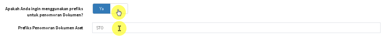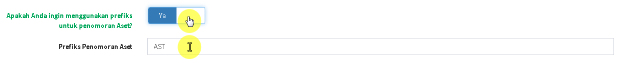 - Ubah slider menjadi YA, jika Anda ingin menambahkan prefiks untuk penomoran setiap Aset. Ubah menjadi TIDAK jika sebaliknya.