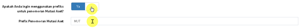 - Pada kolom Prefiks Penomoran Mutasi Aset, tentukan prefiks sesuai dengan keinginan Anda. Tetapi pastikan panjang karakter tidak melebihi 5 karakter. Prefiks hanya berlaku jika Anda memilih YA untuk menggunakan prefiks.
