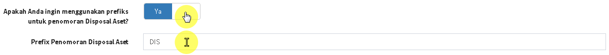 - Ubah slider menjadi YA, jika Anda ingin menambahkan prefiks untuk penomoran Dokumen Disposal. Ubah menjadi TIDAK jika sebaliknya.