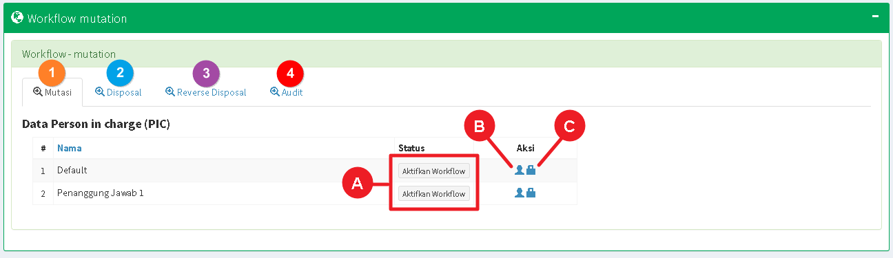 1. Tab Mutasi, yang mengelola workflow untuk transaksi mutasi.