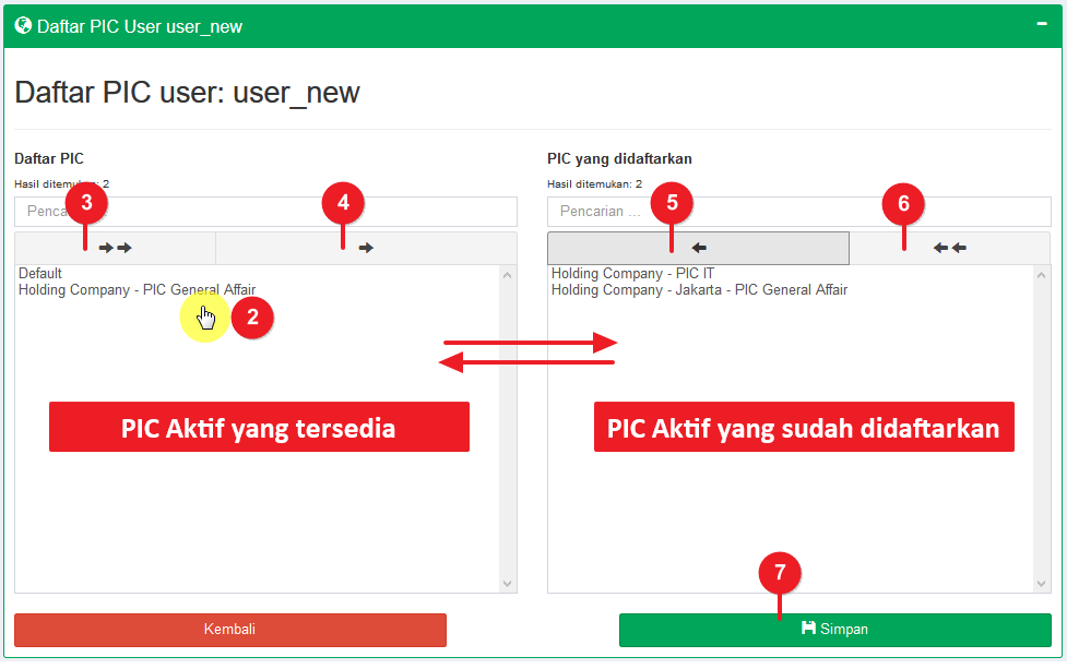 - Klik PIC yang dikehendaki, kemudian klik tombol Move Selected untuk memberikan akses atas PIC yang dipilih.
