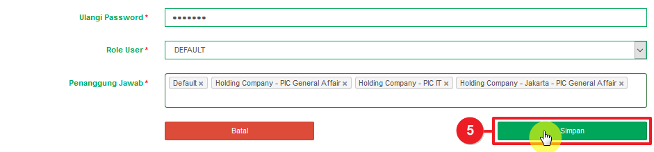 - Klik Simpan untuk mengkonfirmasi pendaftaran User.