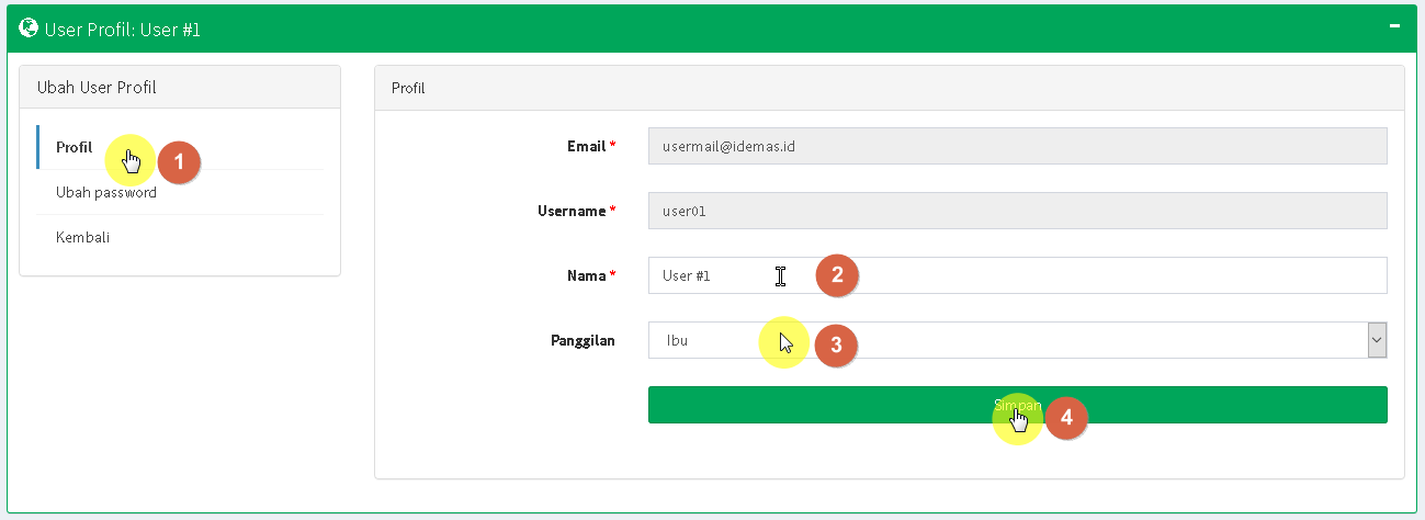 Catatan: User juga dapat melakukan pengubahan profil dan password secara mandiri, dengan mengakses menu Profil pada grup menu Setting.