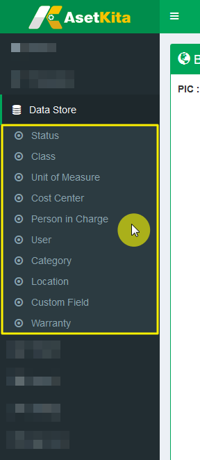 Untuk mengakses halaman Master Data, silahkan pilih salah satu menu yang terdapat dalam grup menu Data Store. Sebagai contoh, jika Anda ingin mengakses halaman Status Aset, silahkan pilih menu Status Aset.