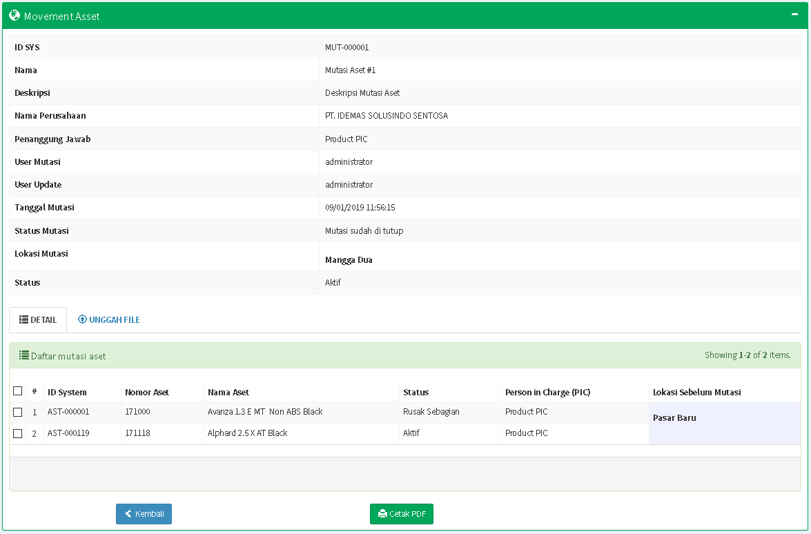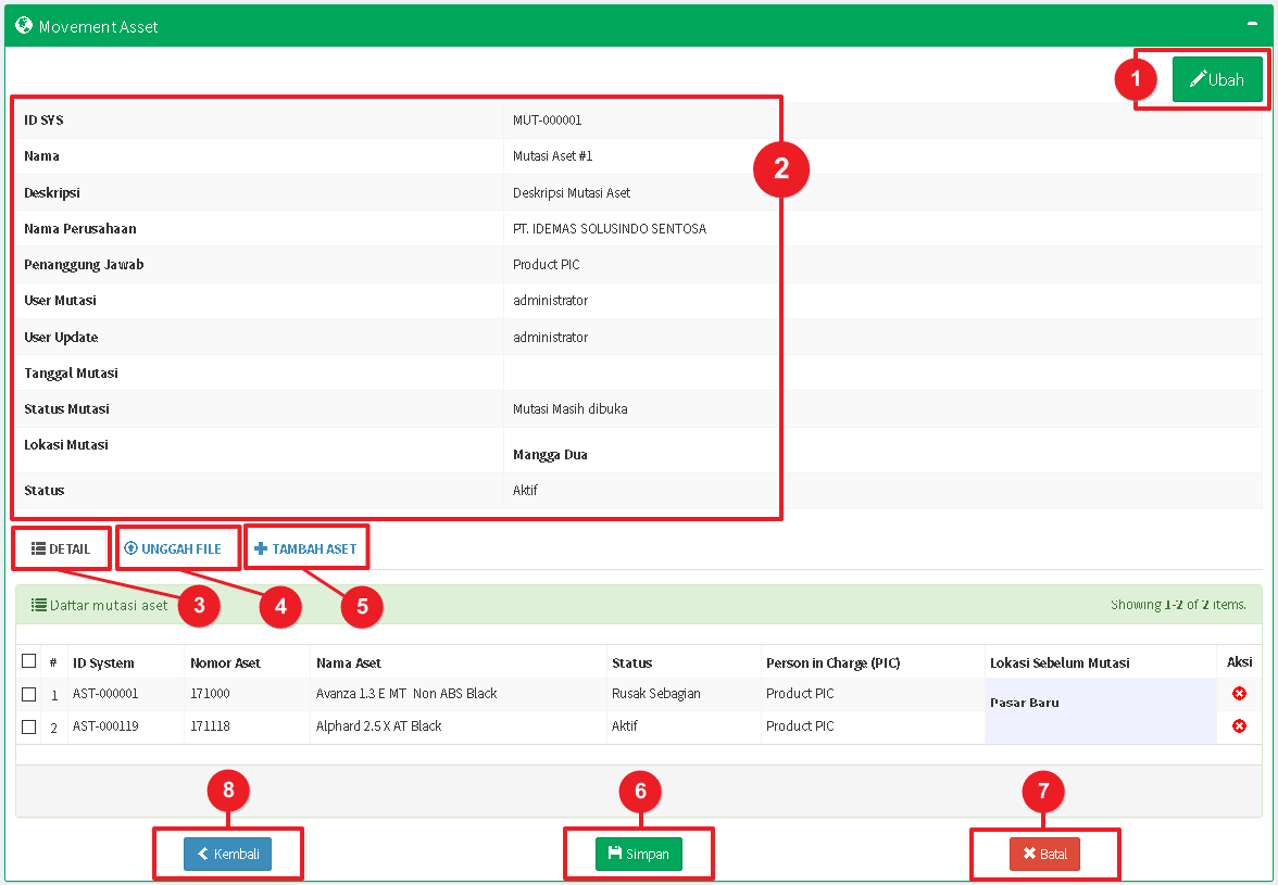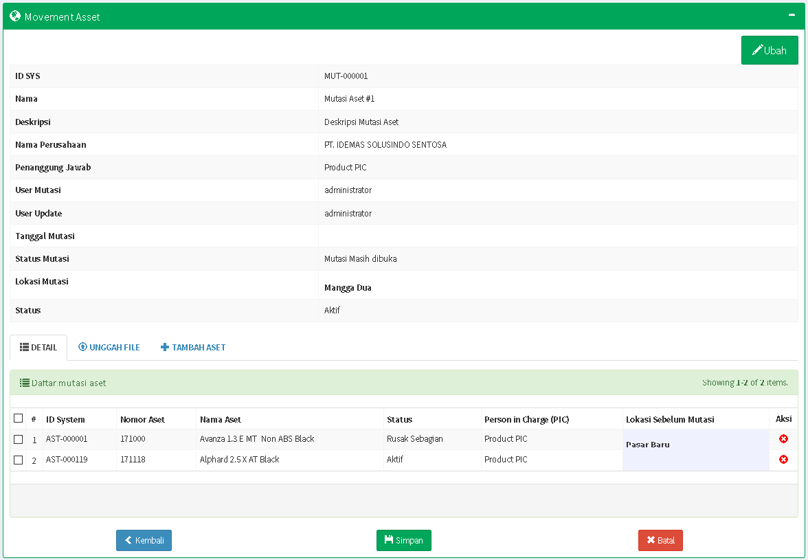 Langkah-langkah Menambahkan Aset ke Dokumen Mutasi - Aset yang berhasil ditambahkan dapat dilihat pada Daftar Mutasi Aset di tab DETAIL.